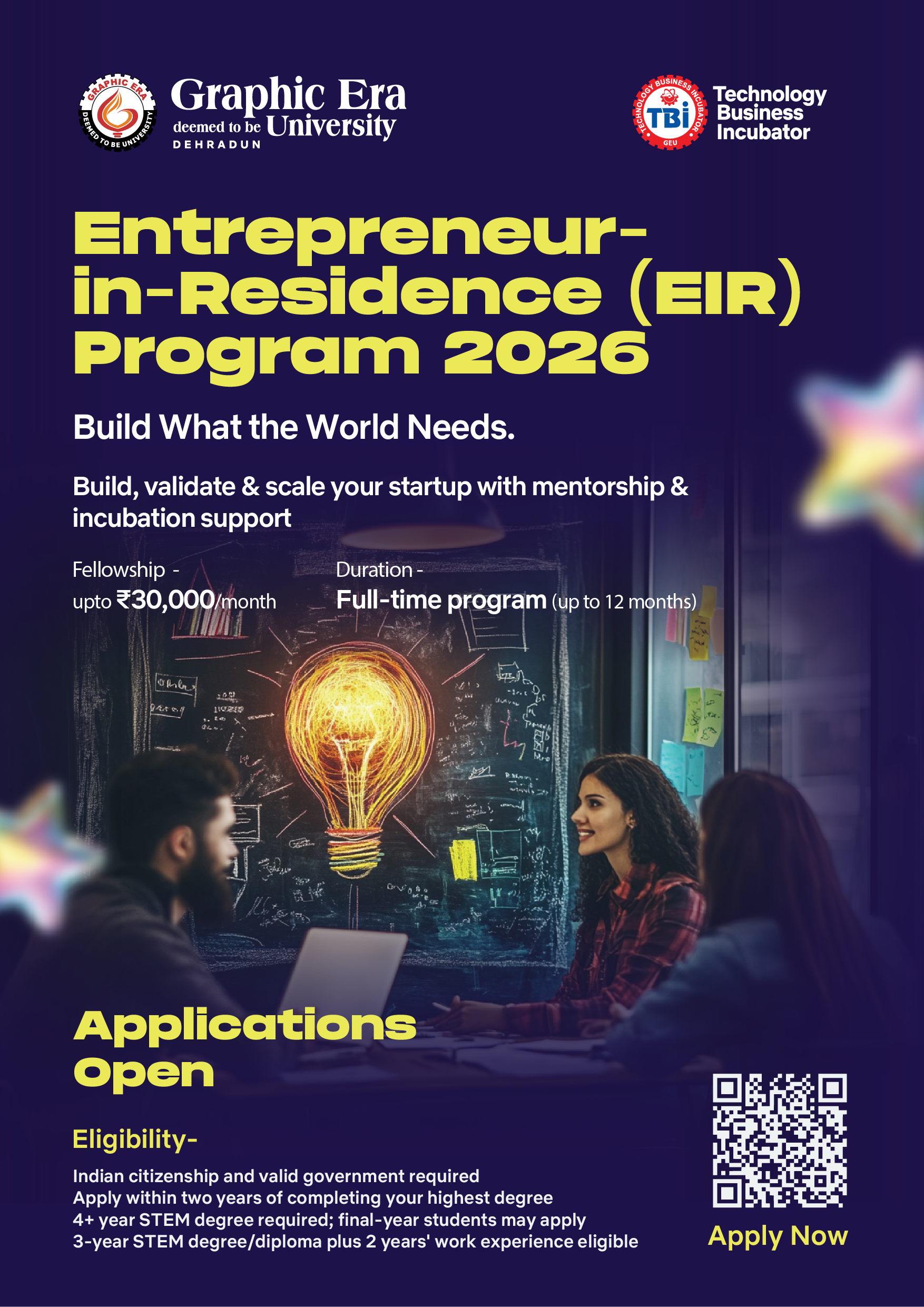 The program is modelled on nationally recognised EIR frameworks, including those supported by DST, and is designed to produce real outcomes: patents filed, prototypes built, companies incorporated, and markets entered.